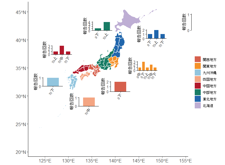 参考までに、2025年の現時点における地域別の観察時期を示した図を掲載します。
