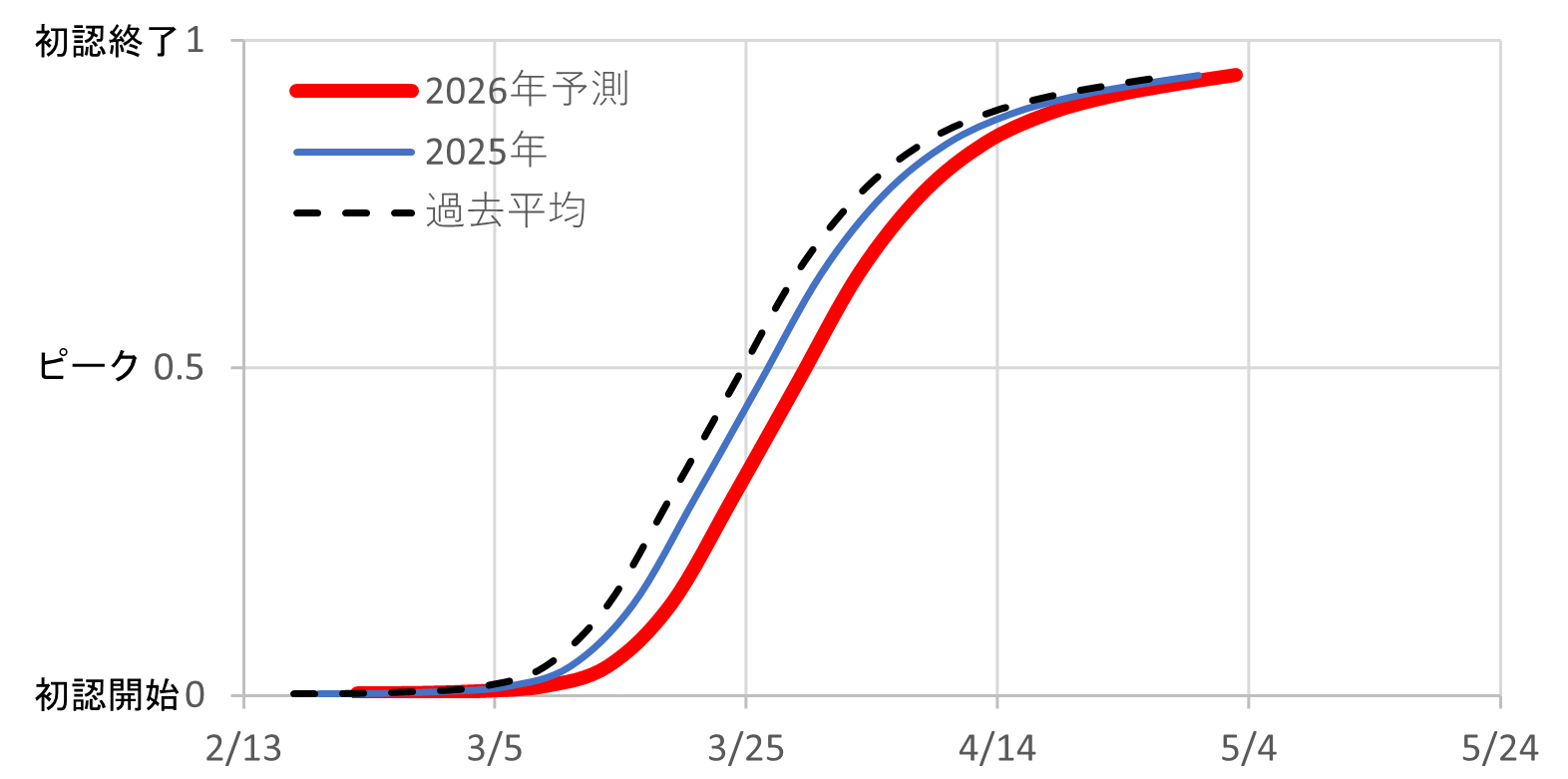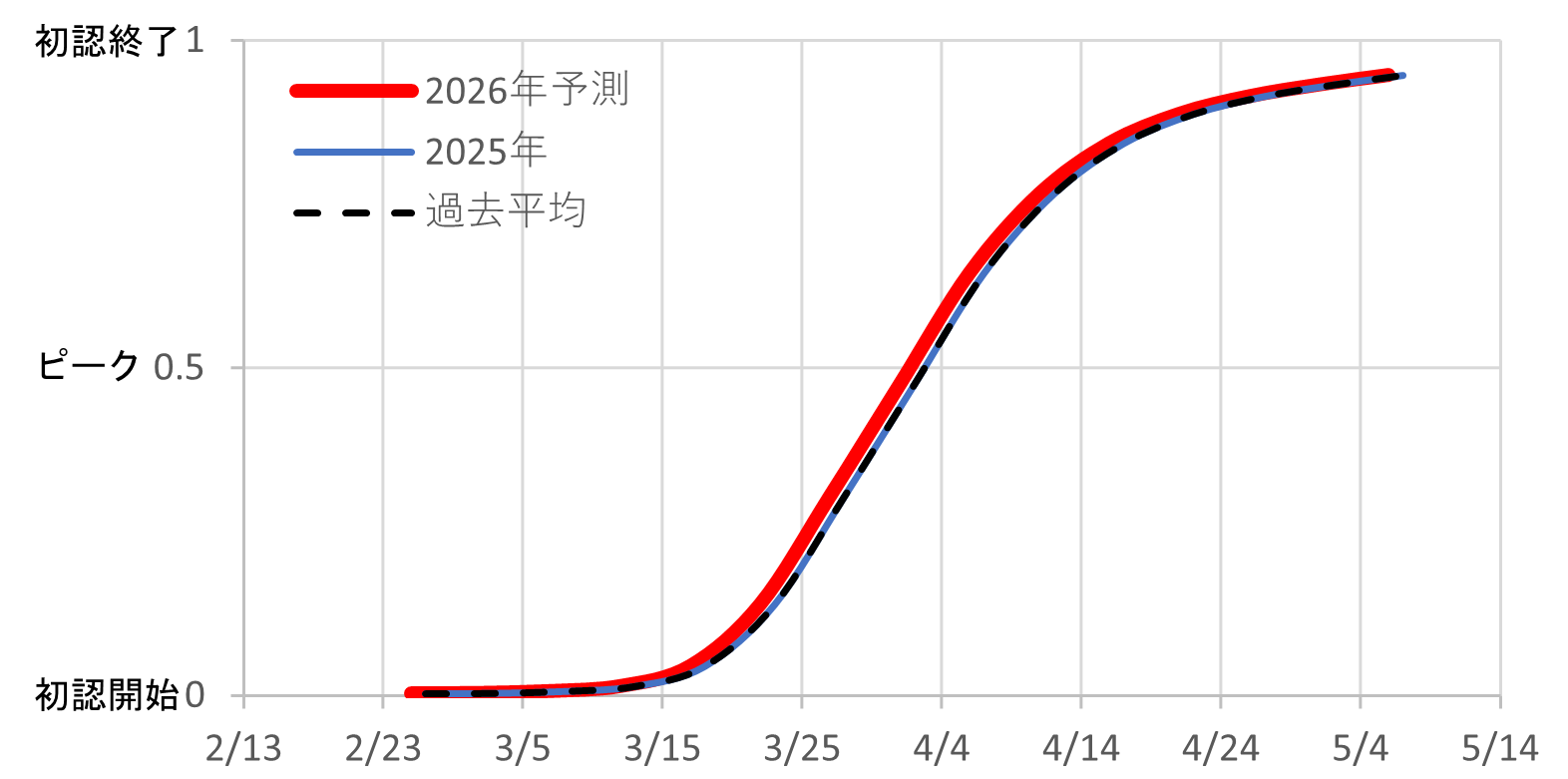 平年よりやや遅い予報となっています。5%の予測日は3月26日、ピーク日は4月10日とされています。