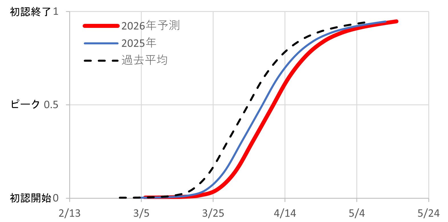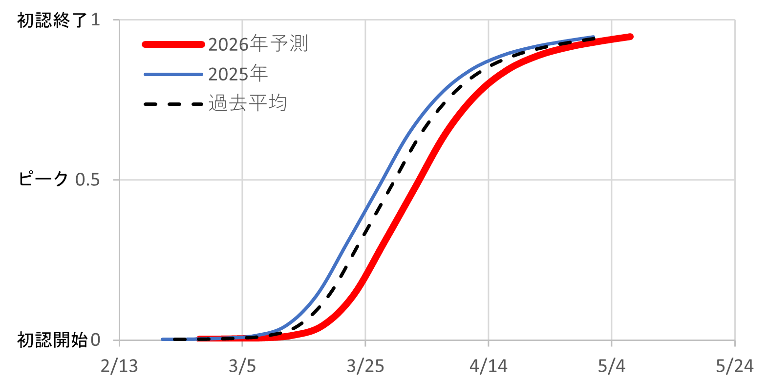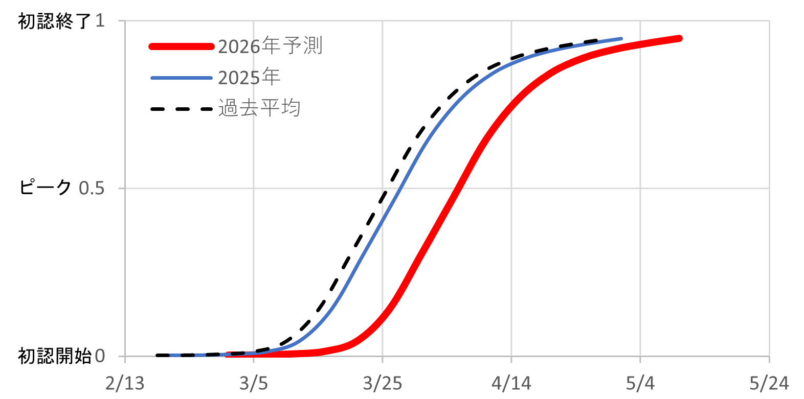 平年より,やや遅い予報となっています。5%の予測日は3月14日、ピーク日は3月29日とされています。
